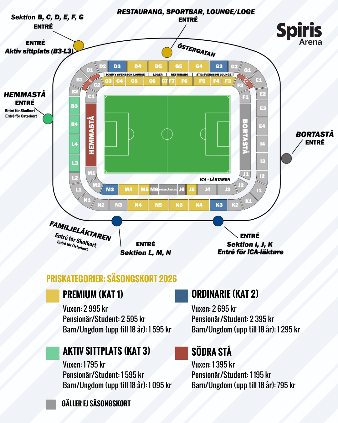 *Du som haft säsongsplats år 2025 har din befintliga sittplats reserverad från den 1 december fram till och med 31 december. Från 1 januari 2026 släpps din plats upp till allmän försäljning.Från den 1 december kan du hämta ut din reservation via ditt Fotbollskonto när du är i inloggat läge på ostersif.ebiljett.nu.