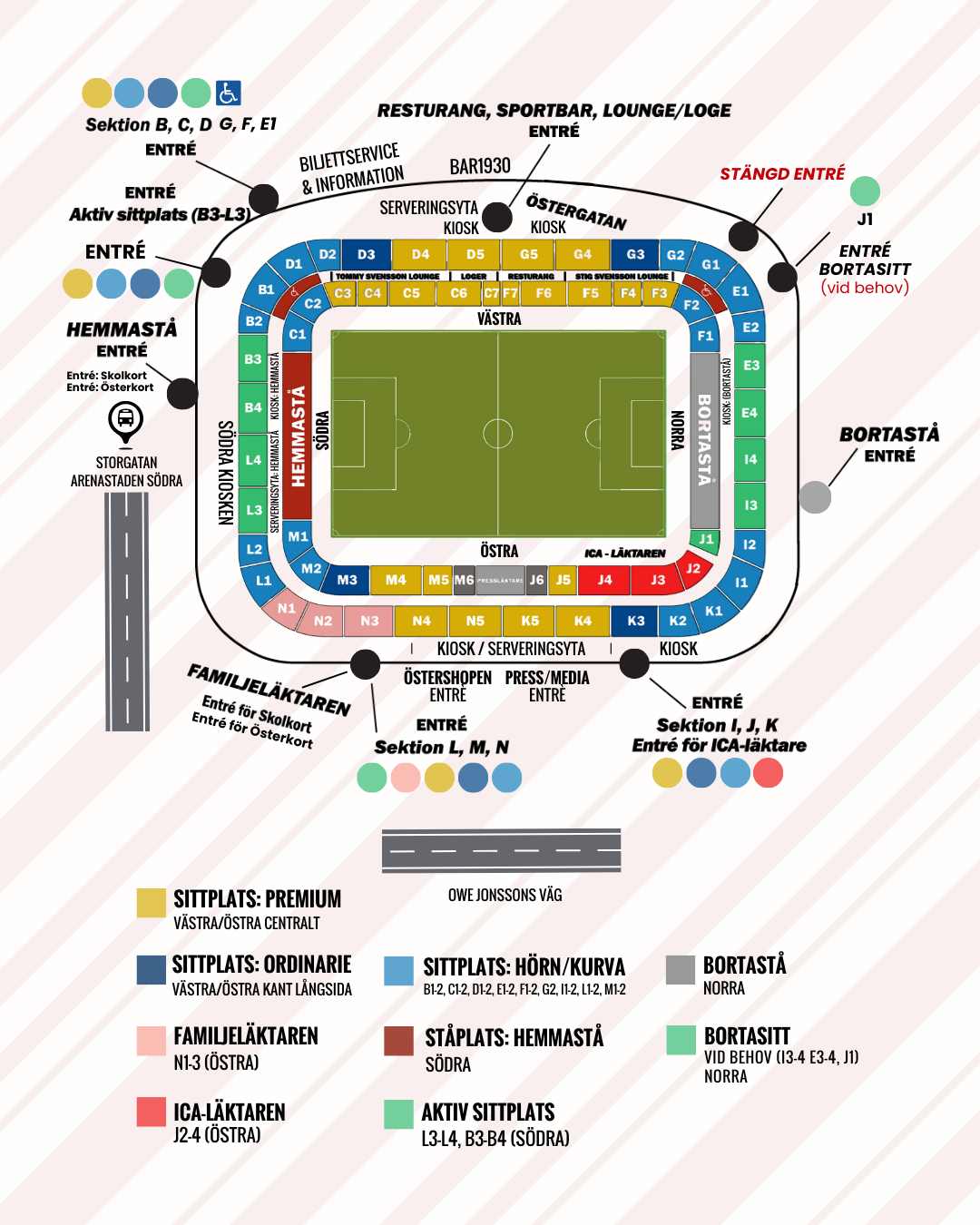 Östergatans restaurang och BAR1930 öppnar två timmar innan avspark. Barområden inne på arenan, Tommy Svensson Lounge samt kiosker öppnar i samband med publikinsläppet, 90 minuter innan avspark.